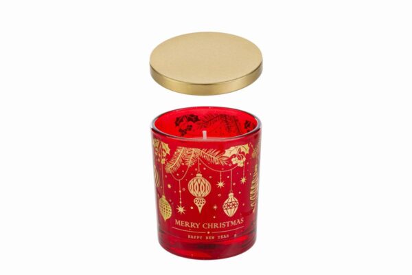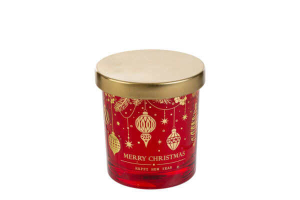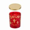 Barattolino in vetro rosso con candela profumata ideale come bomboniera per il periodo natalizio, unisce atmosfera elegante e fragranza delicata in un formato compatto.