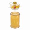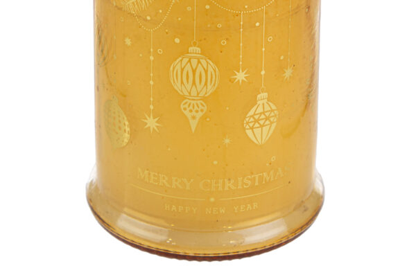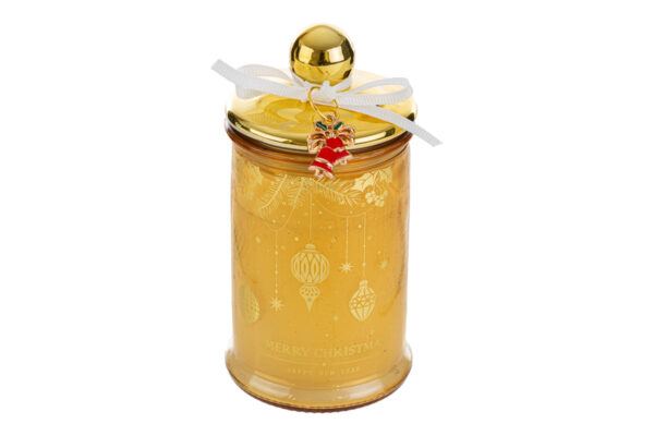 Barattolino candela profumata in vetro dorato, ideale come bomboniera raffinata per il periodo natalizio. Materiale: cera; colore: oro; dimensioni: d.6x h.11 cm.