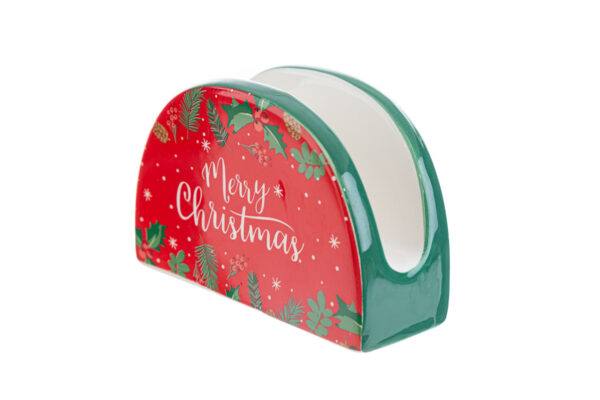 Portatovaglioli in ceramica con decorazione Merry Christmas, ideale come bomboniera natalizia per eventi aziendali o regali di rappresentanza, fornito in elegante astuccio.