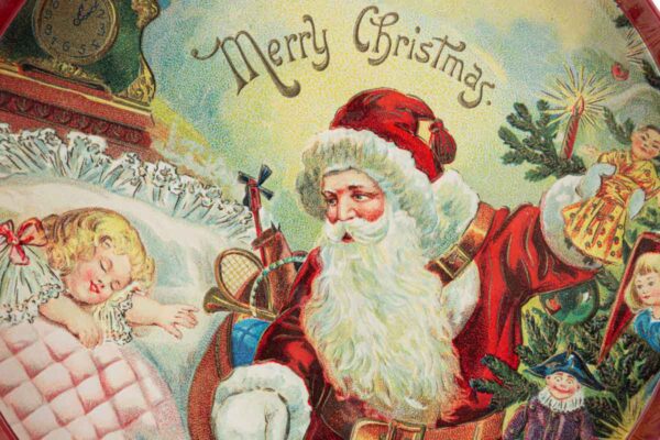 Vassoio in plastica con decorazione Babbo Natale, ideale come bomboniera natalizia. Perfetto per servire dolci o piccoli omaggi durante eventi e festività.