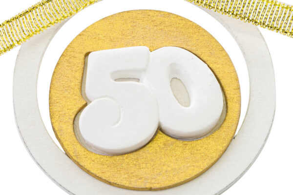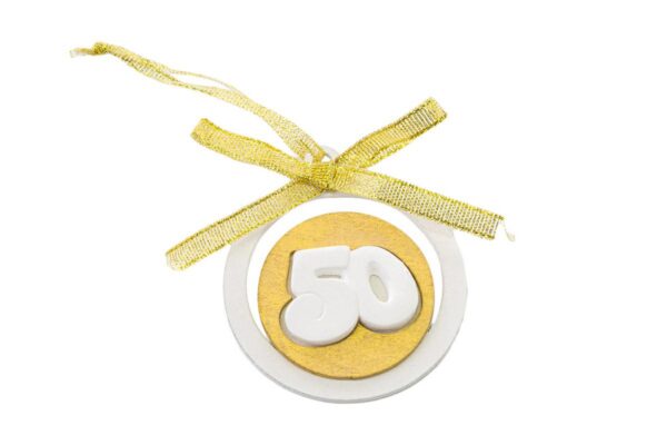 Atmosfera raffinata per il cinquantesimo compleanno con l’appendino in legno e gessetto 50esimOro, dal diametro di 6 cm. Il colore oro unito al materiale in resina dona pregio all’ambiente, rendendolo ideale come bomboniera per festeggiamenti esclusivi. Scelta distintiva per chi cerca qualità senza rinunciare allo stile.