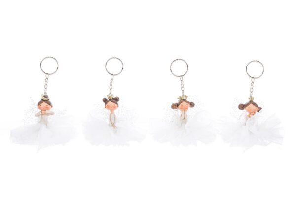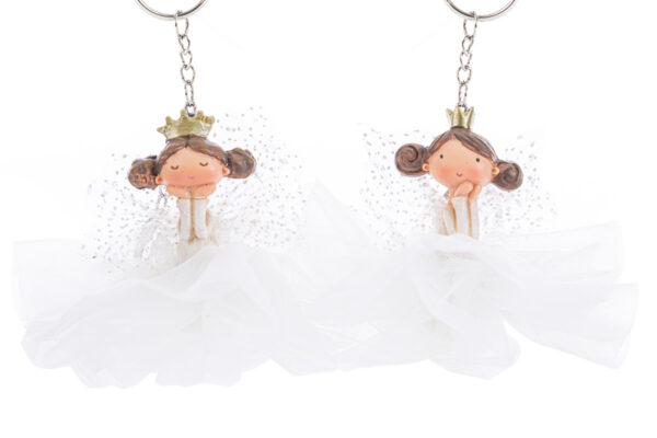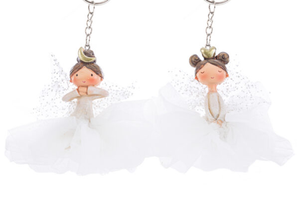 Sfumature raffinate e dettagli curati caratterizzano il portachiavi Fatina in resina, confezionato con organza nei quattro assortimenti da 10 per 14 centimetri. Soluzione ideale come bomboniera per comunione, combina praticità e stile delicato in un accessorio che impreziosisce ogni occasione con discreta originalità.