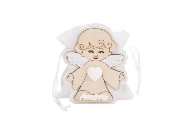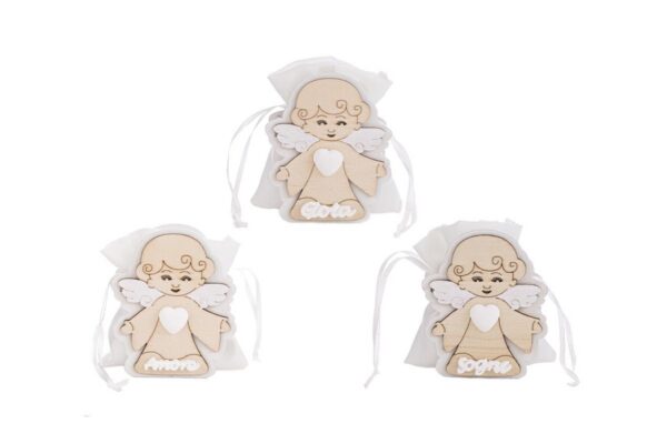 Un tocco raffinato per celebrare momenti importanti, il PORTA SACCHETTO ANGELO 3 ASS. in legno misura 4×6,5xh.8 cm ed è pensato come bomboniera perfetta per una comunione. La qualità dei materiali e lo stile armonioso valorizzano ogni evento con discrezione e gusto contemporaneo.