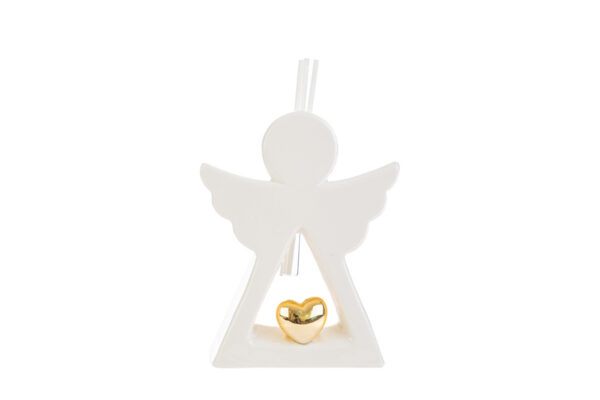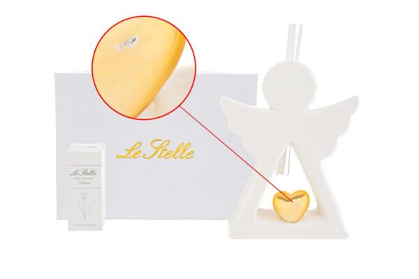 Nessuno è perfetto! Questo raffinato profumatore a forma di angelo è realizzato interamente in porcellana ma presenta qualche difetto sul cuore oro. E’ dotato dell’astuccio. Soluzione ideale come bomboniera per una comunione.