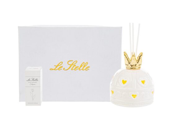 Luminose atmosfere prendono vita con il profumatore in porcellana a forma di corona, impreziosito da luci LED integrate. Dimensione compatta 8xh9 cm e raffinato astuccio lo rendono ideale come bomboniera per comunione. Un oggetto distintivo che unisce praticità e ricercatezza in ogni ambiente.