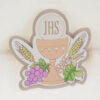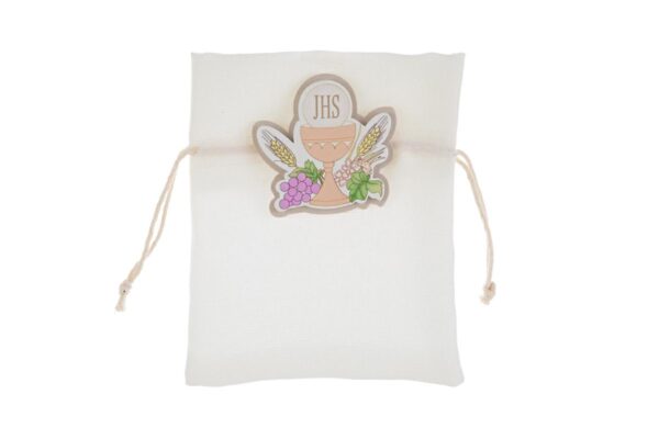 Delicata raffinatezza in ogni dettaglio, questo sacchetto in puro cotone misura 10×12 centimetri e si distingue per il motivo del calice tipico della Prima Comunione. Ideale come bomboniera per valorizzare piccoli doni, esprime cura nella scelta dei materiali e attenzione alle tradizioni. Scelta perfetta per chi desidera lasciare un ricordo sobrio ma di classe nel giorno della comunione.