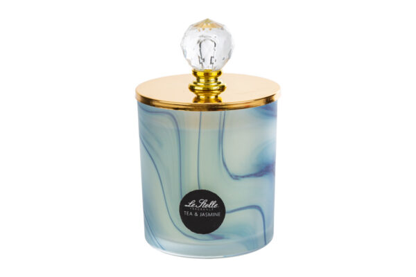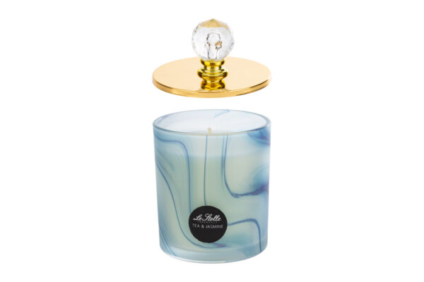 Questa candela blu profumata da 210 grammi, realizzata in vetro, si distingue per il suo elegante design marmorizzato in tonalità azzurre e dettagli dorati. Ideale come bomboniera per matrimonio, offre una profumazione raffinata che valorizza qualsiasi ambiente. L’astuccio coordinato rende la presentazione sofisticata e adatta a occasioni speciali. Le dimensioni compatte di 8 x 12,5 cm permettono una facile collocazione su tavoli o mensole, aggiungendo un tocco di stile e luce discreta.