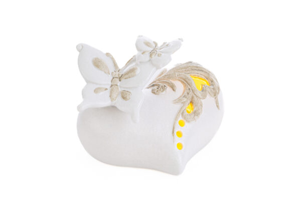 Un raffinato cuore in porcellana, impreziosito da luce LED e dimensioni compatte di 12x8xh.8 cm. Perfetto per donare un tocco elegante e luminoso alla vostra cerimonia. Ideale come bomboniera per matrimoni, combina stile delicato e funzionalità moderna, lasciando un ricordo prezioso ed eterno ai vostri ospiti.