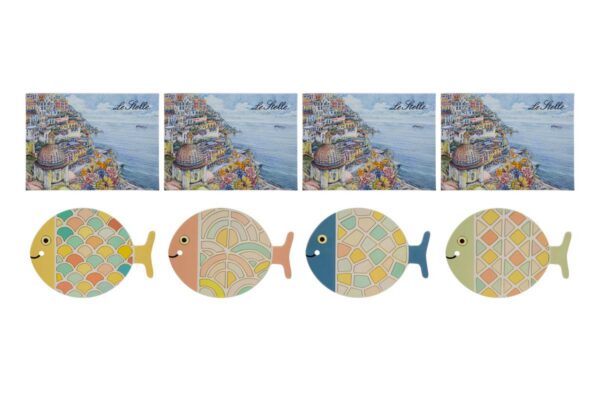 Il poggiapentola Pesciolino in ceramica, proposto in quattro varianti assortite, si distingue per design colorato e forma originale che richiama un pesce stilizzato. Ogni pezzo misura 21×28 cm, offrendo ampia superficie per appoggiare pentole o teiere calde e proteggere i piani di lavoro.