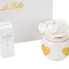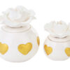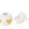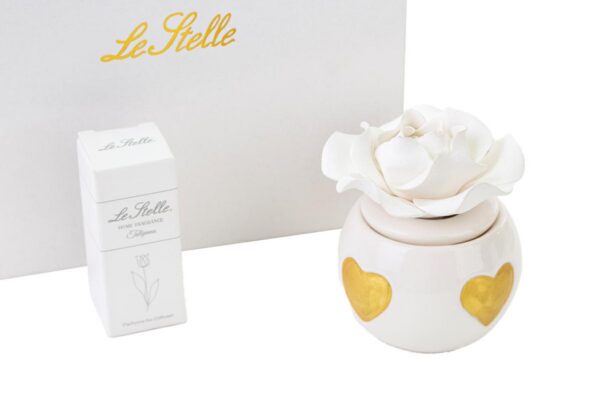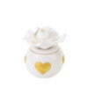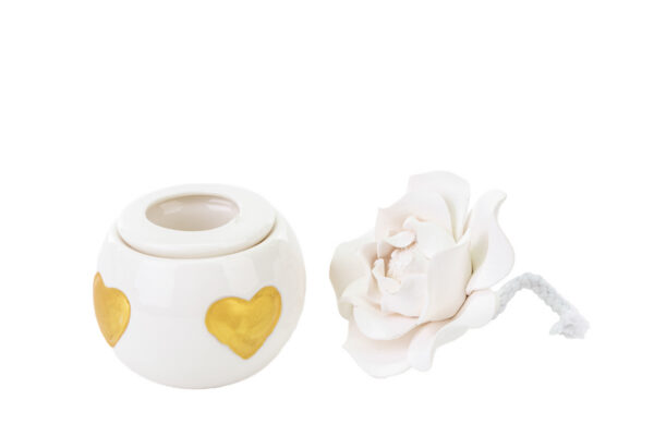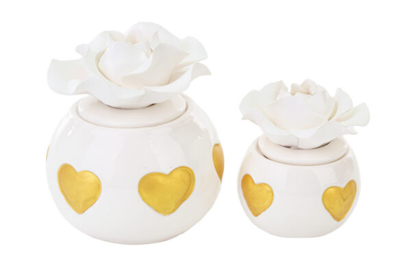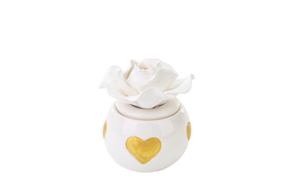 Un delizioso profumatore in porcellana bianca con cuori dorati, perfetto per aggiungere un tocco raffinato a qualsiasi ambiente. Le sue dimensioni compatte di 7 x h.7,5 cm lo rendono ideale come bomboniera per matrimoni, un ricordo prezioso racchiuso in un elegante astuccio.