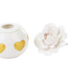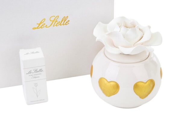 Un raffinato profumatore in porcellana dalla forma di cuore, impreziosito da dettagli dorati. Con dimensioni compatte di 9,5×10 cm e confezionato in un elegante astuccio, è perfetto come bomboniera per matrimoni. Un accessorio delicato che aggiunge un tocco di classe a ogni occasione speciale.