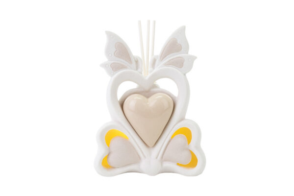 Un armonioso profumatore in porcellana con design a farfalla, dotato di luce LED per creare un’atmosfera unica. Le dimensioni compatte (10x6xh.14 cm) lo rendono perfetto come raffinata bomboniera per matrimoni. Completo di elegante astuccio, è un regalo ideale che unisce stile e praticità quotidiana.