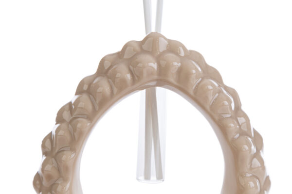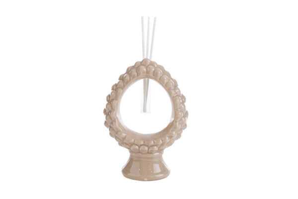 Una raffinata decorazione in porcellana beige che unisce stile e funzionalità. Con le sue dimensioni di 11x6xh.15,5 cm, questo profumatore si distingue per la sua forma a pigna simbolo di prosperità e bellezza. Perfetto come bomboniera per matrimoni, aggiunge un tocco distintivo e sofisticato alla vostra giornata speciale.