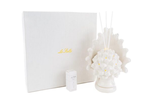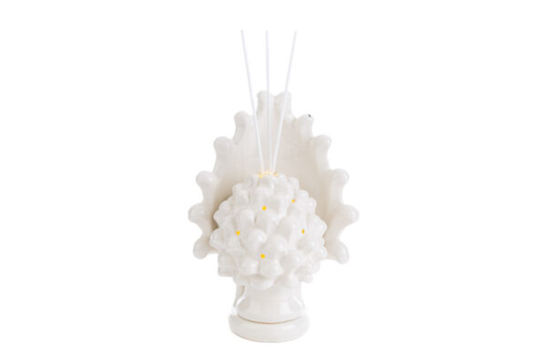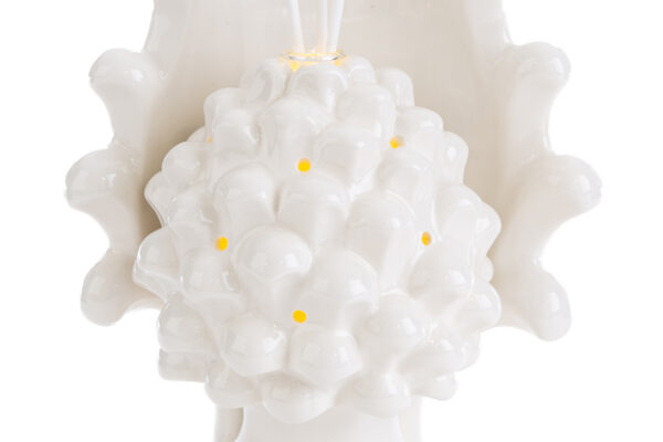 Eleganza e raffinatezza si incontrano nel profumatore a forma di pigna in porcellana bianca, impreziosito da un delicato sistema LED che crea un’atmosfera suggestiva. Le sue dimensioni compatte (15x10xh.21cm) lo rendono ideale come bomboniera per matrimoni, aggiungendo un tocco unico ai vostri momenti speciali. Presentato con astuccio incluso.