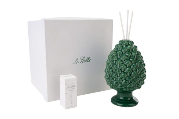 Un tocco di raffinatezza per ogni occasione speciale. Questo profumatore in porcellana verde, impreziosito da un design ispirato alla pigna, combina eleganza e tradizione. Con le sue dimensioni compatte di 9,5×14,5 cm, è perfetto come bomboniera per matrimoni indimenticabili. Completo di astuccio raffinato, regala charme a ogni dettaglio.