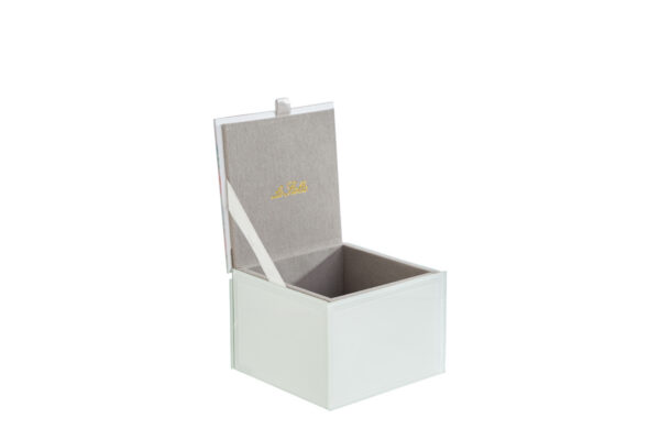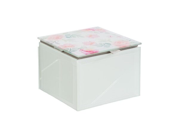 Questa scatola in vetro con coperchio decorato a fiori si distingue per la forma compatta e il design elegante. Ideale come bomboniera per matrimonio, unisce stile e praticità in una soluzione raffinata. La trasparenza del vetro valorizza il contenuto, mentre la struttura resistente protegge ogni ricordo. Inclusa nella confezione una shopper coordinata per una presentazione curata e moderna.