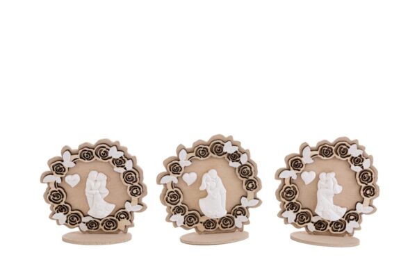 Eleganti segnaposto in legno, perfetti per matrimoni. Con un design raffinato e dettagli curati, si presentano in tre varianti assortite per adattarsi a qualsiasi tema. Le dimensioni compatte di 3×7,5xh.7,5 cm li rendono discreti ma funzionali. Ideali come bomboniere per lasciare agli ospiti un ricordo speciale del grande giorno.