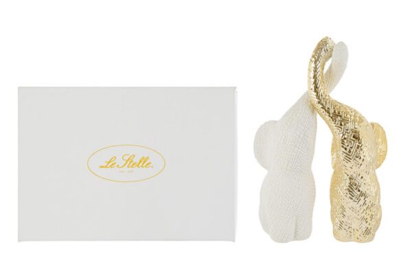 Questo set comprende due elefantini realizzati in porcellana bianca e oro, con un effetto tridimensionale che dona profondità e modernità alla decorazione. La superficie si distingue per la finitura lucida abbinata a dettagli dorati, rendendo il prodotto elegante e raffinato. Ideali come bomboniere per matrimonio, aggiungono un tocco simbolico di fortuna e buon auspicio all’evento. Le dimensioni compatte facilitano la collocazione come oggetto decorativo su tavoli o mensole. La confezione coordinata completa la presentazione e valorizza ulteriormente il dono.