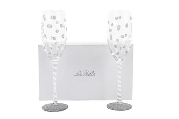 Realizzati in vetro di alta qualità, questi due flûte decorati con dettagli argentati sono un’aggiunta raffinata per celebrare le occasioni più speciali. Con il loro design armonioso e la confezione inclusa, rappresentano una scelta ideale per bomboniere di matrimonio, combinando stile e funzionalità in modo impeccabile.