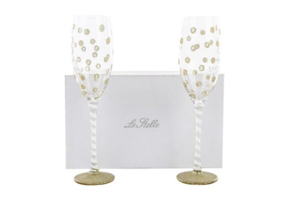Un set raffinato e senza tempo: questi due flute in vetro con decorazioni dorate sono la scelta ideale per celebrare un matrimonio speciale. Con altezza di 23 cm, sono perfetti come bomboniere che uniranno stile e praticità. Eleganza discreta racchiusa in un prezioso astuccio da regalare o conservare.