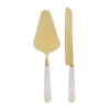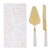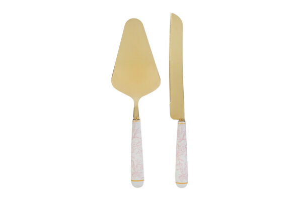 Questo set da due pezzi include una paletta e un coltello torta in metallo con eleganti manici decorati rosa. La finitura dorata valorizza i dettagli, rendendolo perfetto come bomboniera per matrimoni. Ideale per tagliare e servire la torta durante le cerimonie, offre un tocco raffinato e coordinato al momento del festeggiamento. La confezione con astuccio agevola sia la presentazione sia la conservazione degli utensili.
