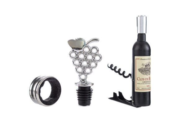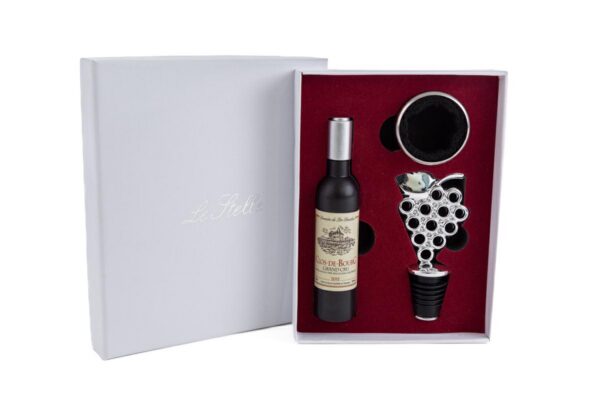 Un set elegante e indispensabile per gli amanti del vino, composto da tre pratici accessori realizzati in metallo di alta qualità. Perfettamente racchiuso in un raffinato astuccio, è ideale come bomboniera per un matrimonio grazie alla sua combinazione di stile e funzionalità. Un dettaglio che sorprende.