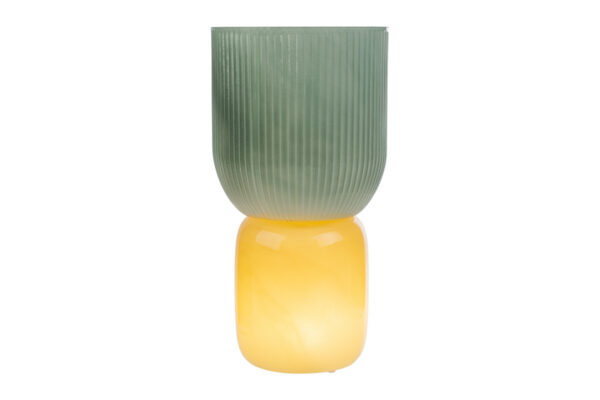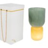 Il vaso in vetro Lampada Verde d.12xh.23 cm si distingue per un design moderno, caratterizzato da una base opaca sui toni giallo ambra e una parte superiore verde con lavorazione a coste verticali. La confezione elegante con dettagli dorati sottolinea la sua destinazione come bomboniera per matrimonio. Grazie alle sue dimensioni compatte, si adatta facilmente sia come elemento decorativo che come contenitore per piccoli fiori o candele. Il materiale in vetro contribuisce a conferire luminosità e raffinatezza agli ambienti. La presenza della confezione raffinata rende il prodotto pronto per essere donato durante eventi speciali.