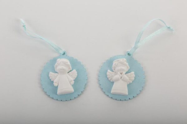 Un raffinato appendino in legno con dettagli celesti, impreziosito da un delicato angioletto in resina. Perfetto come bomboniera per celebrare una nuova nascita o un battesimo, è un dettaglio unico che aggiunge un tocco di dolcezza e significato a ogni occasione speciale.
