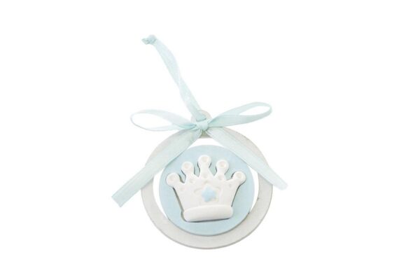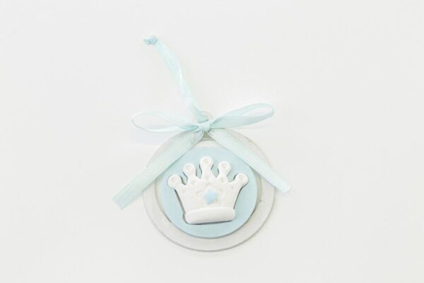 Realizzato in resina con dettagli curati, questo raffinato appendino a forma di corona color celeste è perfetto per celebrare momenti speciali. Ideale come bomboniera sia per una nuova nascita che per un battesimo, aggiunge un tocco delicato e significativo a ogni occasione.