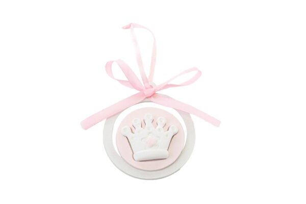 Raffinato appendino in legno con gessetto a forma di corona, ideale per festeggiare momenti speciali come una nuova nascita o un battesimo. Il delicato colore rosa si unisce al materiale in resina per offrire un decoro tenero e versatile, perfetto per bomboniere che lasciano il segno.