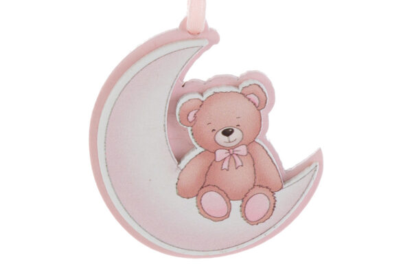 Perfetta per celebrare momenti speciali, questa bomboniera in legno di qualità è un dettaglio raffinato e delicato. Con il suo design a forma di luna con orsetto e la tonalità rosa tenue, è ideale sia per una nuova nascita che per un battesimo. Un tocco di semplicità ricca di significato.