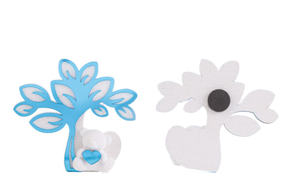 Un delizioso ornamento in vetro color celeste, perfetto per celebrare momenti speciali. Questa calamita a forma di albero con orsetto è ideale come bomboniera sia per una nascita che per un battesimo. Unisce stile e dolcezza, aggiungendo un tocco unico ad ogni ricorrenza.