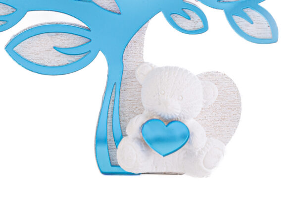 Un delizioso ornamento in vetro color celeste, perfetto per celebrare momenti speciali. Questa calamita a forma di albero con orsetto è ideale come bomboniera sia per una nascita che per un battesimo. Unisce stile e dolcezza, aggiungendo un tocco unico ad ogni ricorrenza.