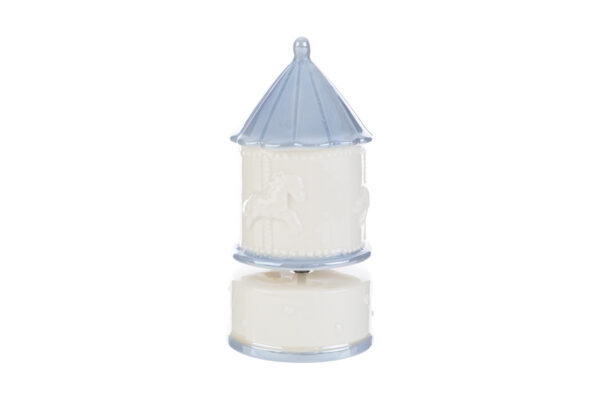 Un raffinato carillon in porcellana dal delicato colore celeste, perfetto per celebrare momenti speciali. La sua forma armoniosa e le dimensioni di 8x8xh.16,5 cm lo rendono ideale come bomboniera sia per una nuova nascita che per un battesimo. Completo di astuccio elegante, è un ricordo prezioso che coniuga stile e significato affettivo.
