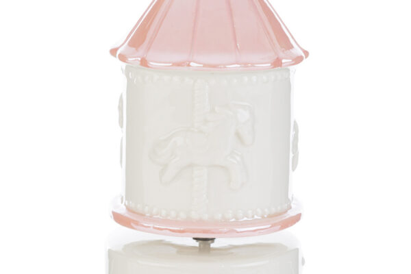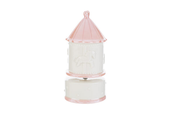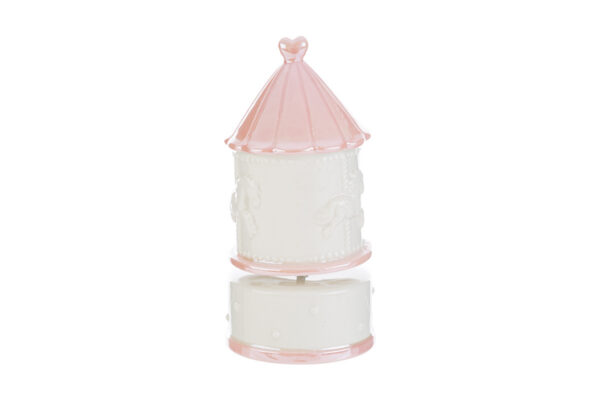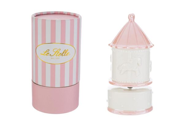 Un raffinato carillon giostrina in porcellana rosa, pensato per impreziosire momenti speciali. Con le sue dimensioni di 8x8xh.16,5 cm e un elegante astuccio incluso, è il dono ideale per celebrare una nascita o un battesimo. Un ricordo unico e senza tempo che conquista al primo sguardo.
