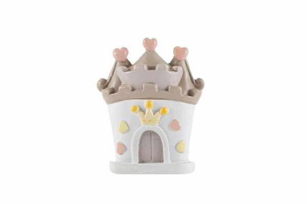 Un incantevole castello in miniatura realizzato in resina, perfetto come bomboniera. Un simbolo delicato e raffinato che celebra momenti speciali come una nascita o un battesimo, aggiungendo un tocco magico ai ricordi. Dimensioni compatte di 4×5 cm ideali per ogni occasione unica.