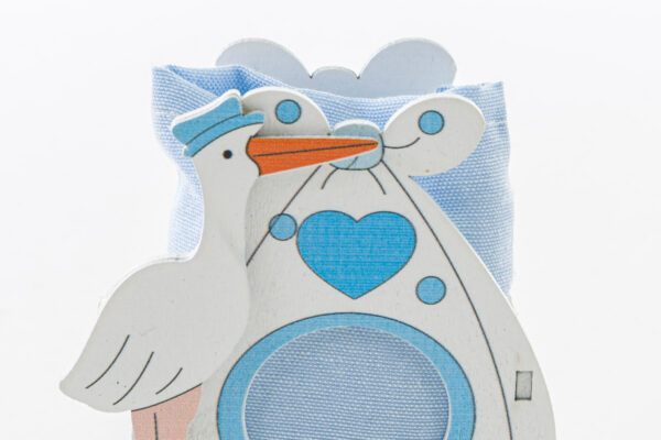 Un’adorabile cicogna in legno celeste con sacchetto, dalle dimensioni compatte di 6,5×3,5xh.8 cm. Ideale come bomboniera per celebrare una nuova nascita o un battesimo. Il raffinato dettaglio in raso e il delicato colore celeste aggiungono un tocco di stile e armonia a ogni occasione speciale.