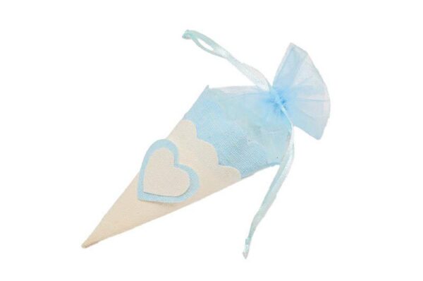 Realizzato in juta color celeste, questo cono da 16 cm unisce praticità e stile per confezioni raffinate. Perfetto come bomboniera per celebrare una nuova nascita o un battesimo, offre un tocco semplice ma curato che si adatta a ogni occasione speciale.