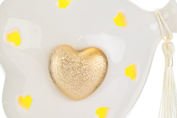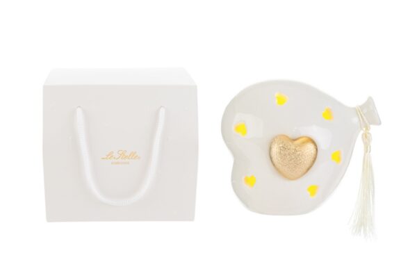 Un design raffinato e un tocco di luce per celebrare momenti speciali. Questo cuore in porcellana bianca con LED integrato e il dettaglio del cuore dorato misura 11x8x11 cm, perfetto come bomboniera per una nuova nascita o un battesimo. Completo di shopper coordinato, un ricordo prezioso che illumina ogni occasione.