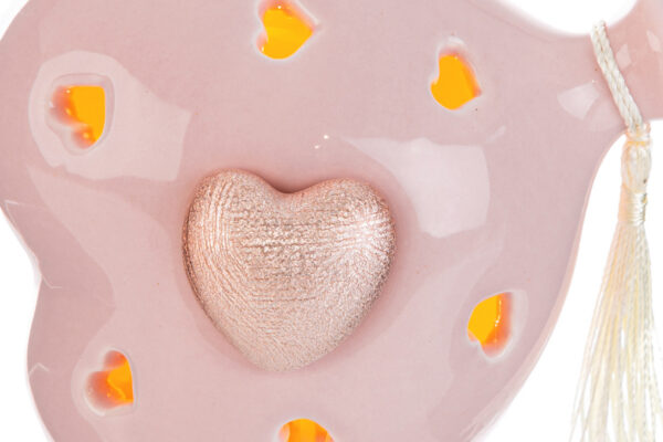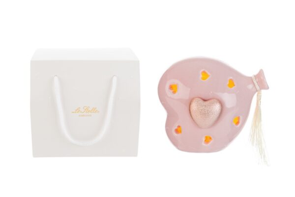 Un raffinato cuore Led rosa a forma di palloncino in porcellana arricchito con un cuoricino satinato e la nappina laterale che dona eleganza e delicatezza. Dimensioni 11x8x11 cm, perfetto come bomboniera per celebrare la gioia di una nuova nascita, il battesimo o il compleanno della vostra piccola. I Milky Colors, tonalità tenui e lattiginose, sono tra i più amati del momento per le decorazioni delle camerette.  Completo di shopper abbinata pronta per essere donata.