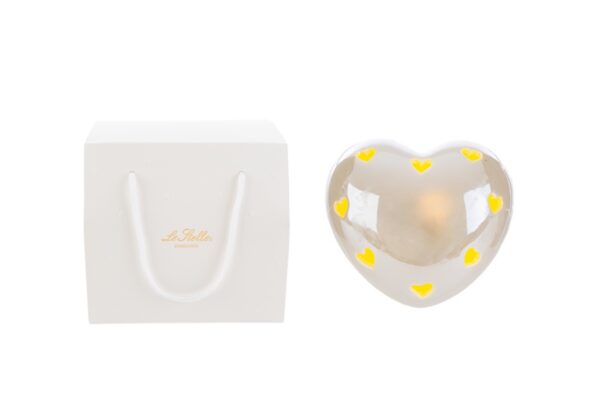 Dettaglio raffinato in porcellana bianca, il cuore dalle dimensioni compatte 8x8xh.5 cm si presenta come un simbolo di affetto e purezza. Ideale come bomboniera per celebrare con stile nascite e battesimi, include una shopper dallo charme discreto che ne esalta l’eleganza senza tempo.