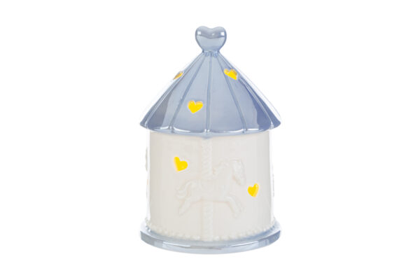 Un raffinato tocco di stile per celebrare momenti speciali. Realizzata in porcellana celeste, questa giostrina LED è l’ideale come bomboniera per nascite o battesimi. Dimensioni compatte di 10x10xh14 cm, viene fornita con un pratico astuccio per una presentazione impeccabile e curata nei dettagli.