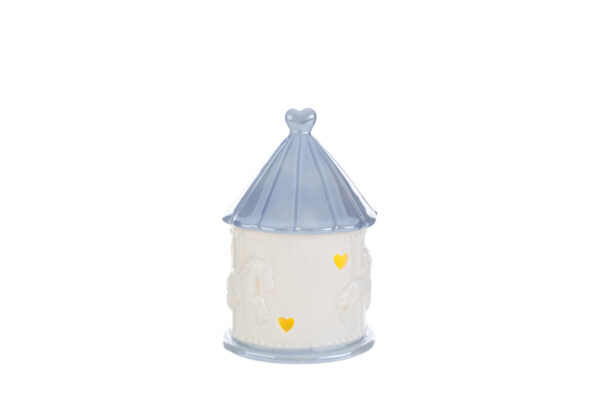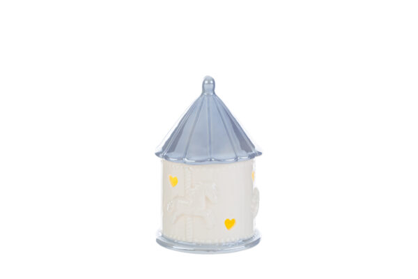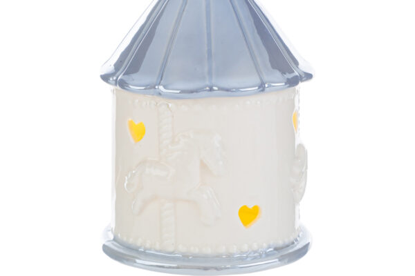 Raffinata giostrina in porcellana dal delicato colore celeste, perfetta per celebrare momenti speciali. Ideale come bomboniera per una nuova nascita o un battesimo, unisce stile ricercato e semplicità in un design intramontabile. Presentata con astuccio elegante, è pensata per lasciare un ricordo unico e significativo.
