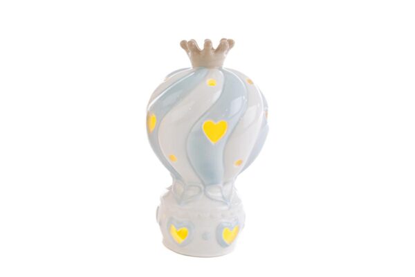Una raffinata mongolfiera in porcellana celeste, perfettamente lavorata per aggiungere un tocco di raffinatezza a qualsiasi occasione speciale. Ideale come bomboniera per celebrare una nuova nascita o un battesimo, questo oggetto unico coniuga stile e significato. Misura compatta da 9 x 14 cm per una presentazione impeccabile.