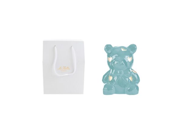 Un delizioso orsetto in porcellana celeste, impreziosito da luce LED, perfetto per celebrare momenti speciali. Ideale come bomboniera per una nuova nascita o un battesimo, unisce raffinatezza e funzionalità. Completo di elegante shopper coordinato, aggiunge un tocco unico a ogni occasione significativa.