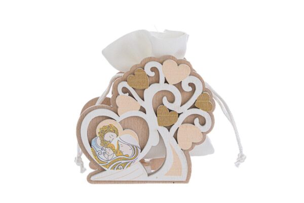 Un raffinato porta sacchetto in legno decorato con l’immagine della Sacra Famiglia. Dimensioni compatte di 4x9xh.8,5 cm che lo rendono perfetto per ogni occasione speciale. Ideale come bomboniera per celebrare una nascita o un battesimo, unendo praticità e simbolismo in uno stile sobrio e armonioso.