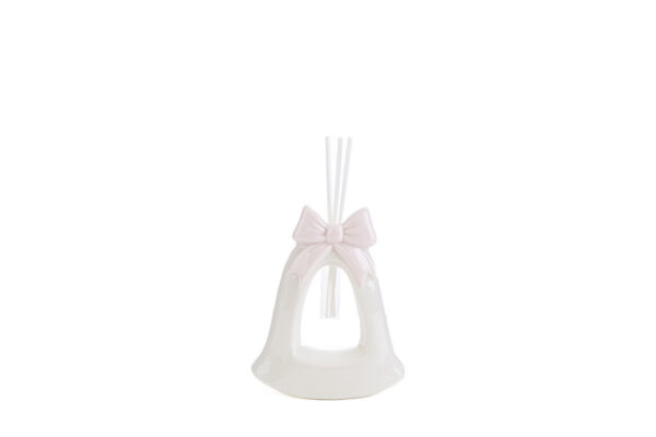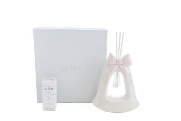Un raffinato profumatore a forma di campana, realizzato in porcellana rosa, perfetto per celebrare con stile momenti speciali. Le sue dimensioni compatte di 9,5x4xh.11 cm lo rendono ideale come bomboniera per una nuova nascita o un battesimo. Completo di astuccio elegante, è un dono che combina praticità e bellezza senza tempo.
