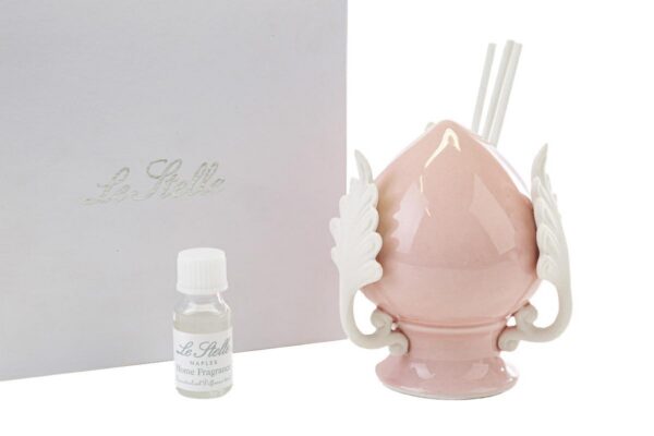 Un raffinato profumatore in porcellana rosa, perfetto per impreziosire gli ambienti con un tocco delicato e distintivo. Grazie al suo design elegante e alle dimensioni contenute (10×11 cm), si adatta facilmente a qualsiasi spazio. Ideale come bomboniera versatile per celebrare una nuova nascita o un battesimo con stile e sobrietà.
