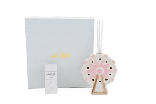 Un design raffinato in porcellana rosa che cattura l’attenzione a prima vista. Questo profumatore a forma di ruota panoramica è perfetto come bomboniera, ideale per celebrare una nuova nascita o un battesimo con stile e delicatezza. Dimensioni compatte: 8x4xh.10 cm, pratico ed elegante, si adatta armoniosamente a ogni spazio regalando un tocco di dolcezza e unicità alla vostra occasione speciale.
