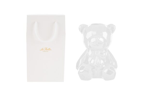 Sofisticato salvadanaio a forma di orsetto, realizzato in porcellana bianca. Un accessorio dai toni delicati e dal design raffinato, ideale come bomboniera per celebrare una nuova nascita o un battesimo. Le dimensioni compatte 14x13xh.18 cm lo rendono perfetto per ogni spazio e completo di shopper elegante.